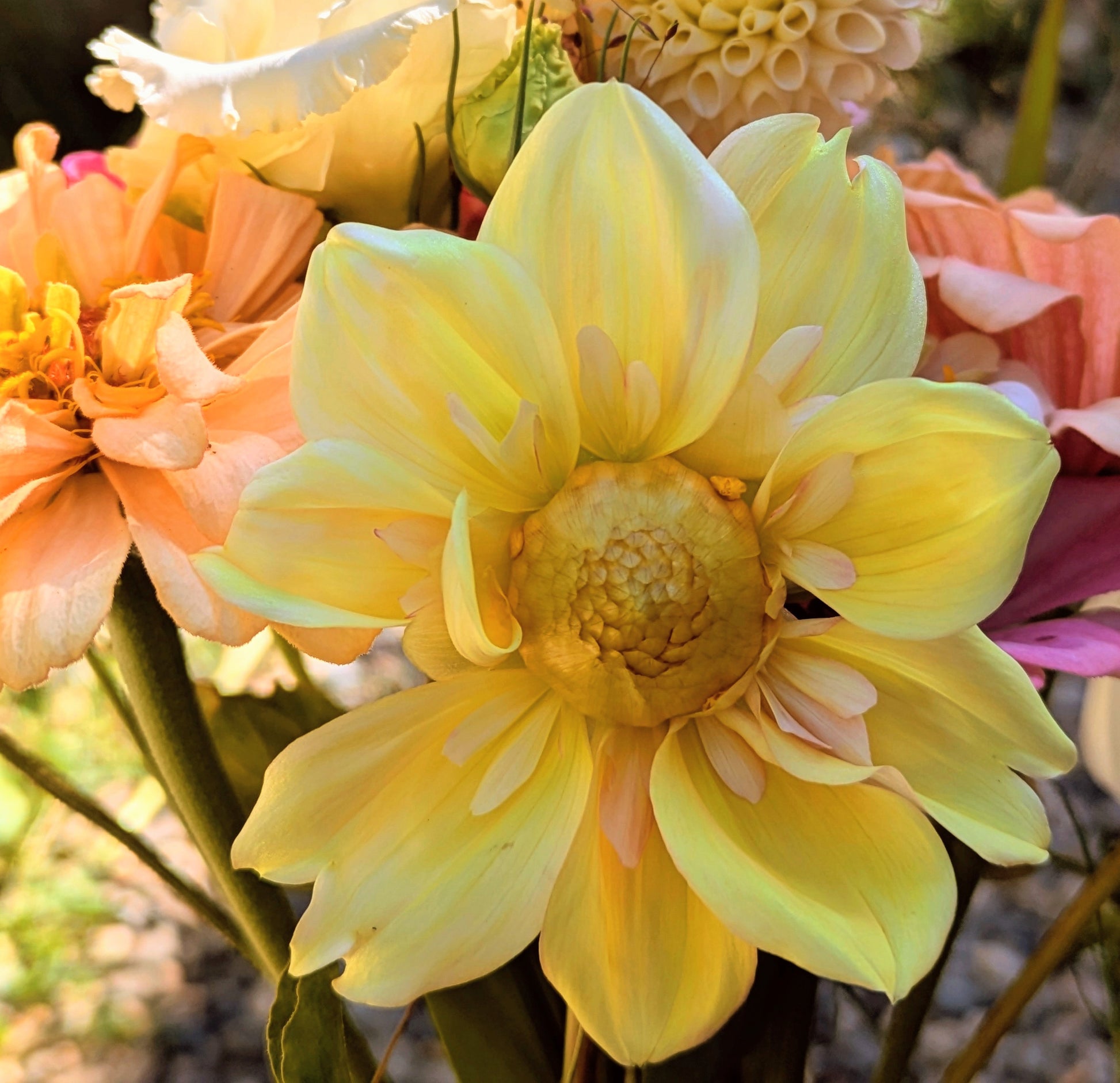 Collarette type with small-medium 3-6 inch blooms. Growing 4-5 ft. Creamy yellow to blush pink petals.
